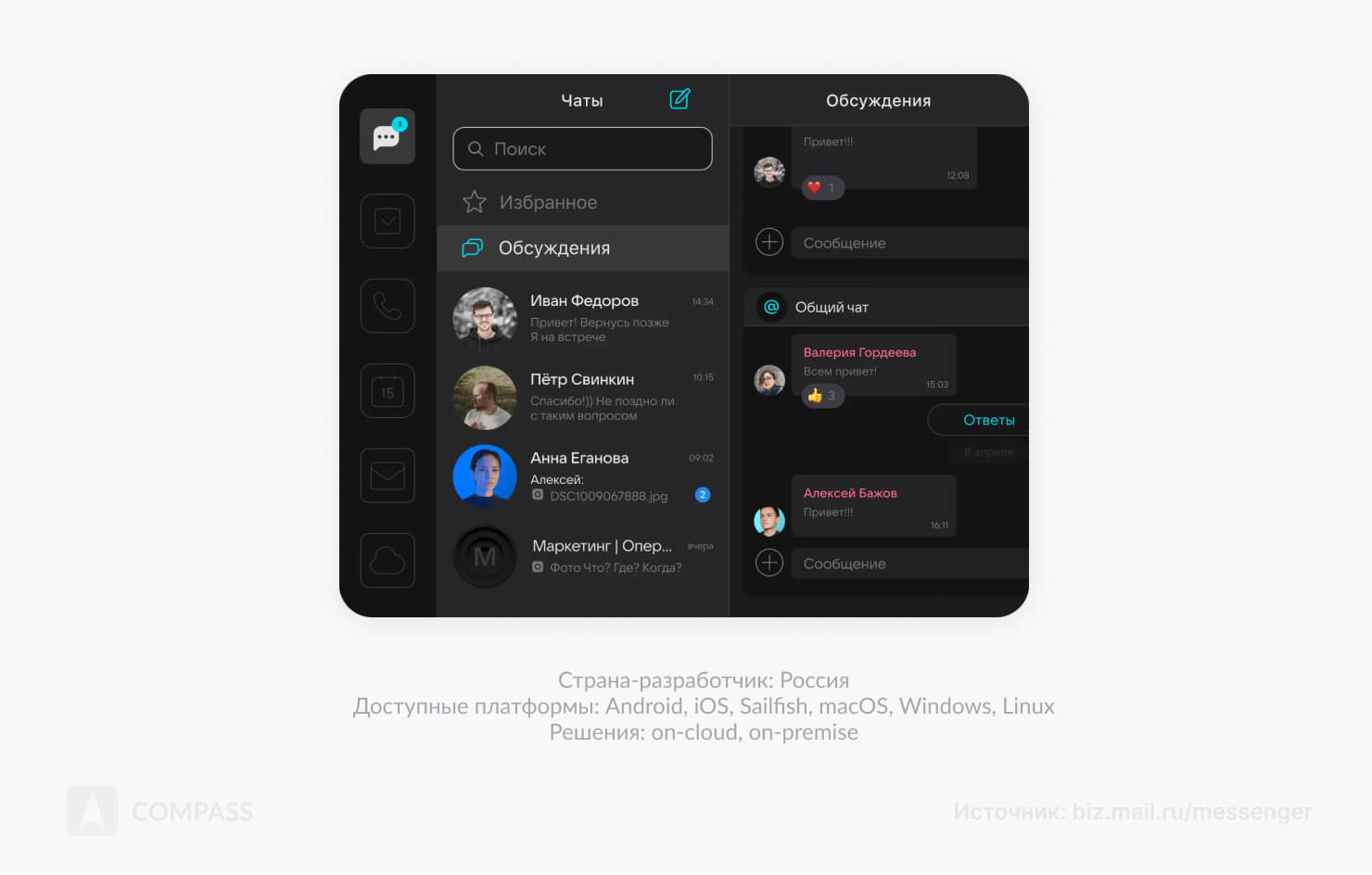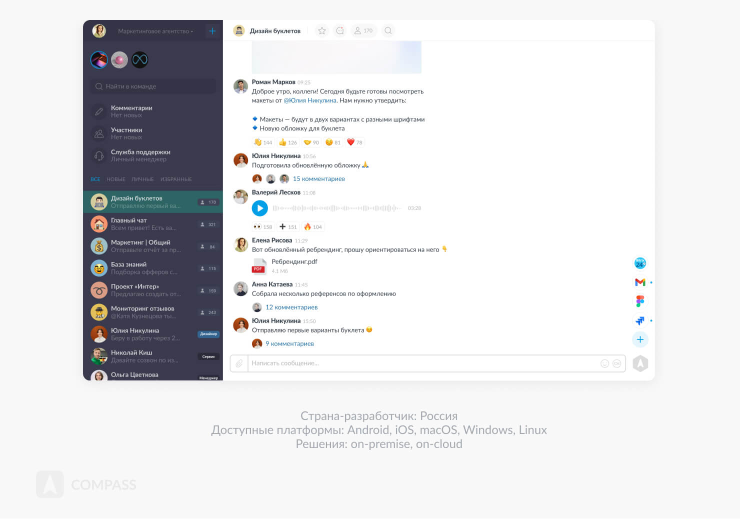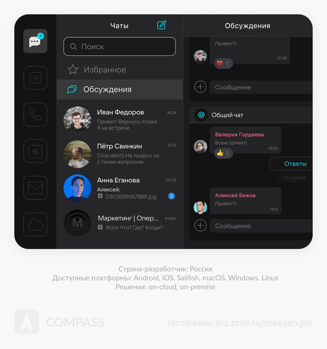 Также эти мессенджеры не предназначены для работы больших команд, у которых не один-два чата, а несколько десятков чатов для разных отделов. У корпоративного мессенджера Compass инструменты, наоборот, разработаны под общение команд и защиту конфиденциальных данных.