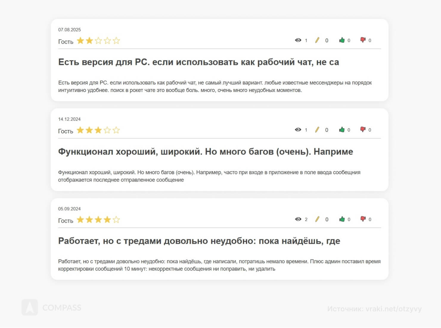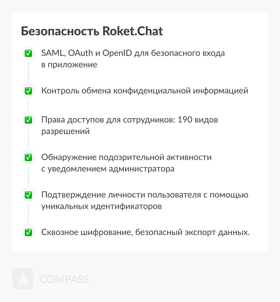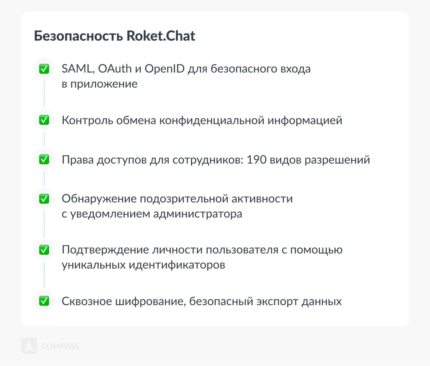 Также эти мессенджеры не предназначены для работы больших команд, у которых не один-два чата, а несколько десятков чатов для разных отделов. У корпоративного мессенджера Compass инструменты, наоборот, разработаны под общение команд и защиту конфиденциальных данных.