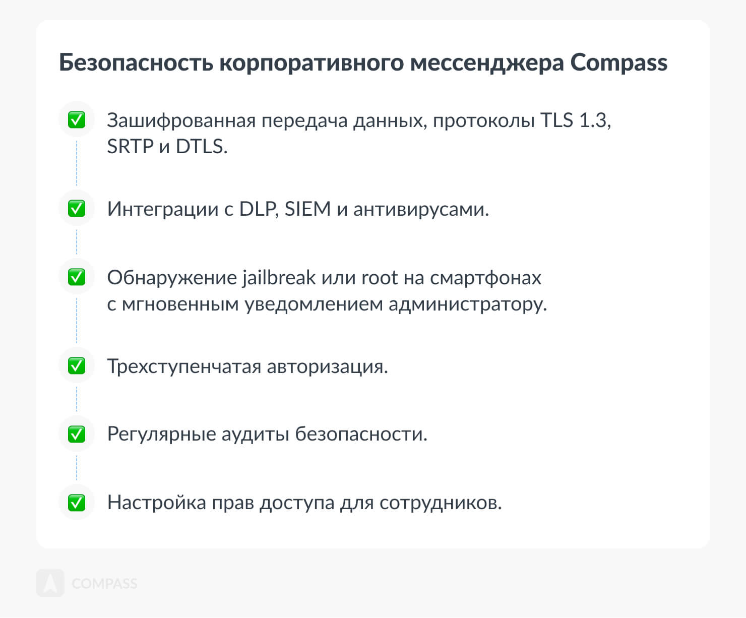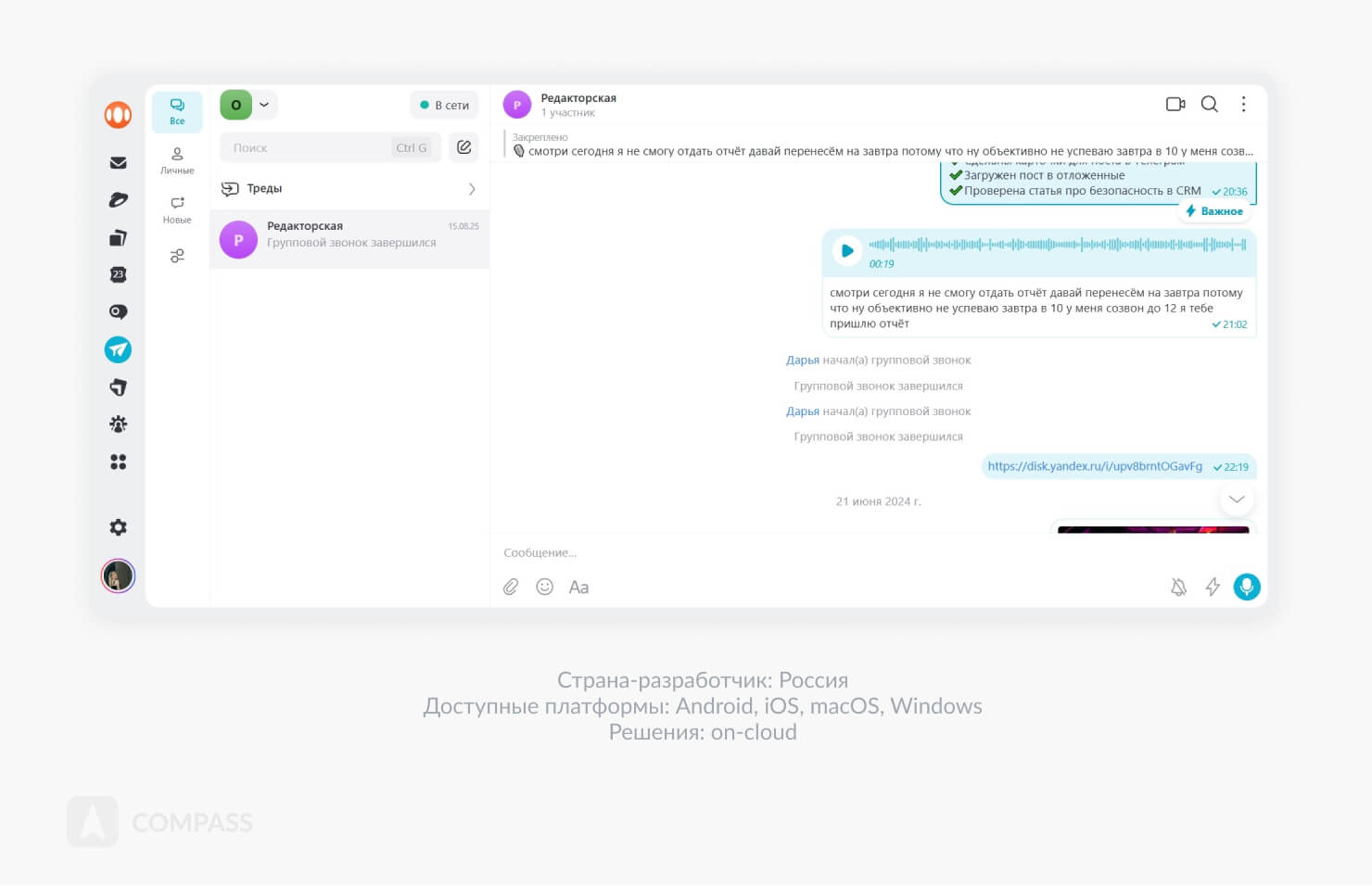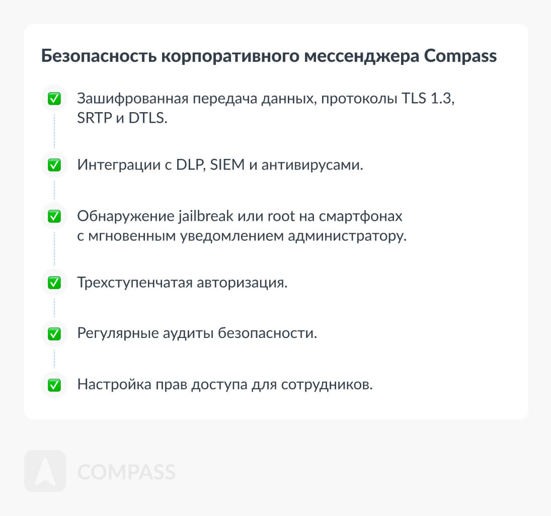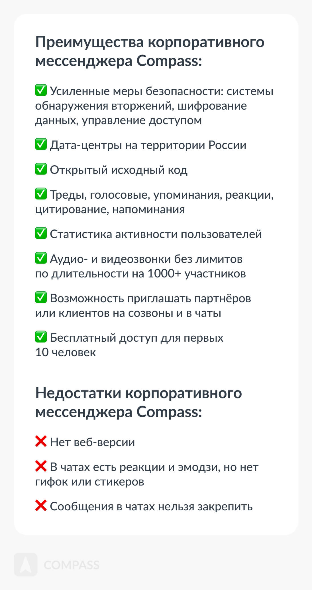 Compass — безопасный мессенджер со встроенными звонками и видеоконференциями. Продукт российской компании, внесенный в перечень отечественного ПО. В отличие от иностранных мессенджеров WhatsApp* и Telegram, все дата-центры Compass находятся в России. Безопасность оборудования подтверждена международными стандартами ISO и ФСТЭК. Для защиты данных предпринят ряд мер: