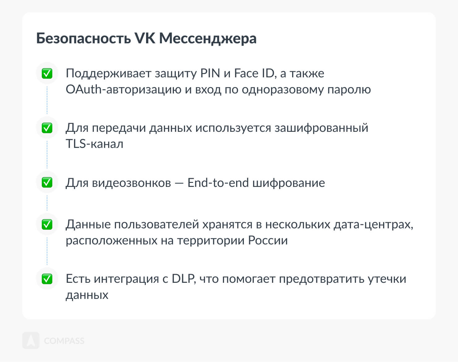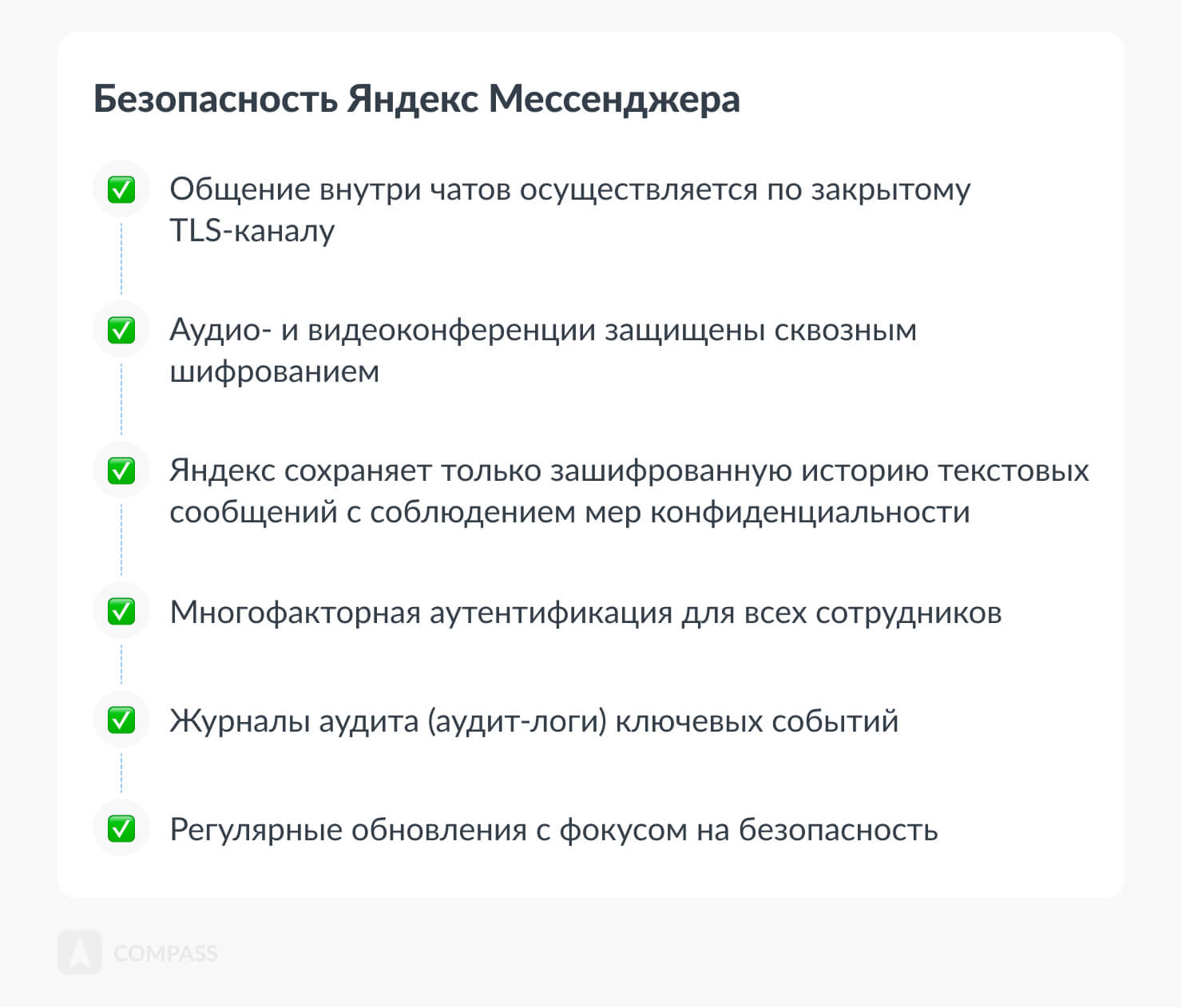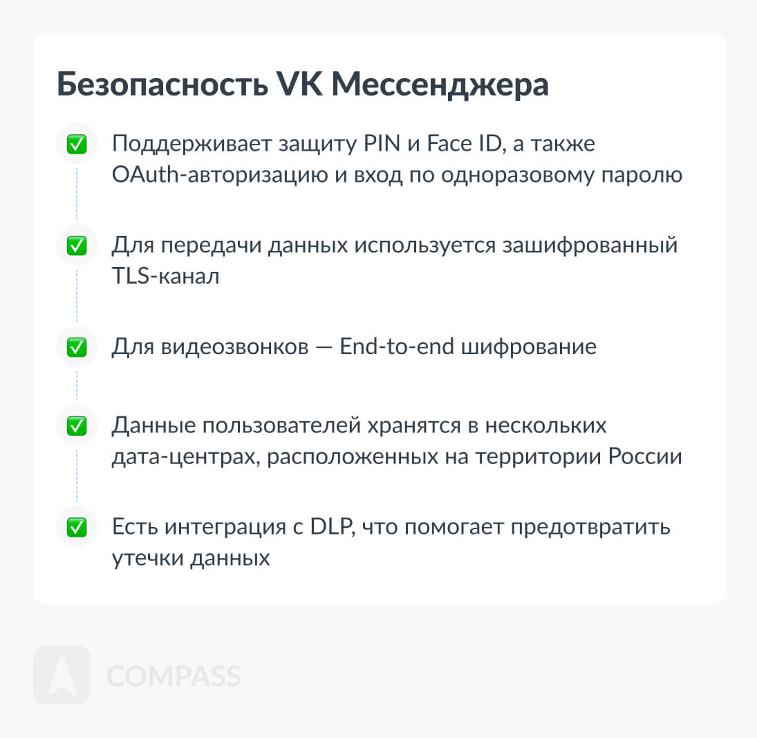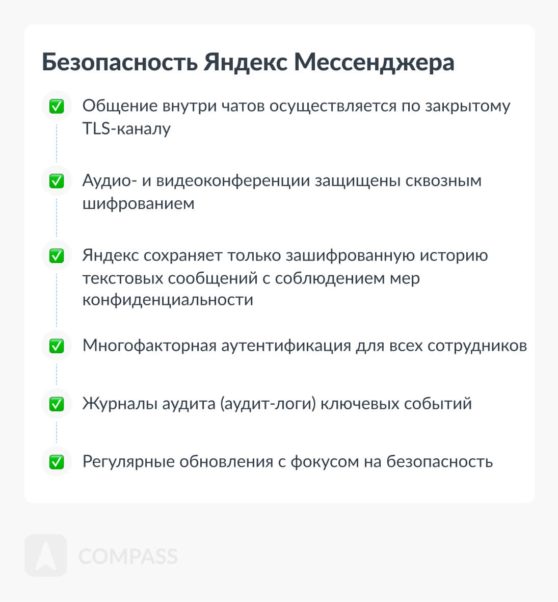 Compass — безопасный мессенджер со встроенными звонками и видеоконференциями. Продукт российской компании, внесенный в перечень отечественного ПО. В отличие от иностранных мессенджеров WhatsApp* и Telegram, все дата-центры Compass находятся в России. Безопасность оборудования подтверждена международными стандартами ISO и ФСТЭК. Для защиты данных предпринят ряд мер: