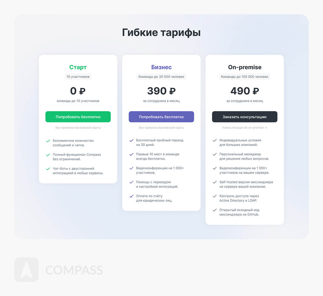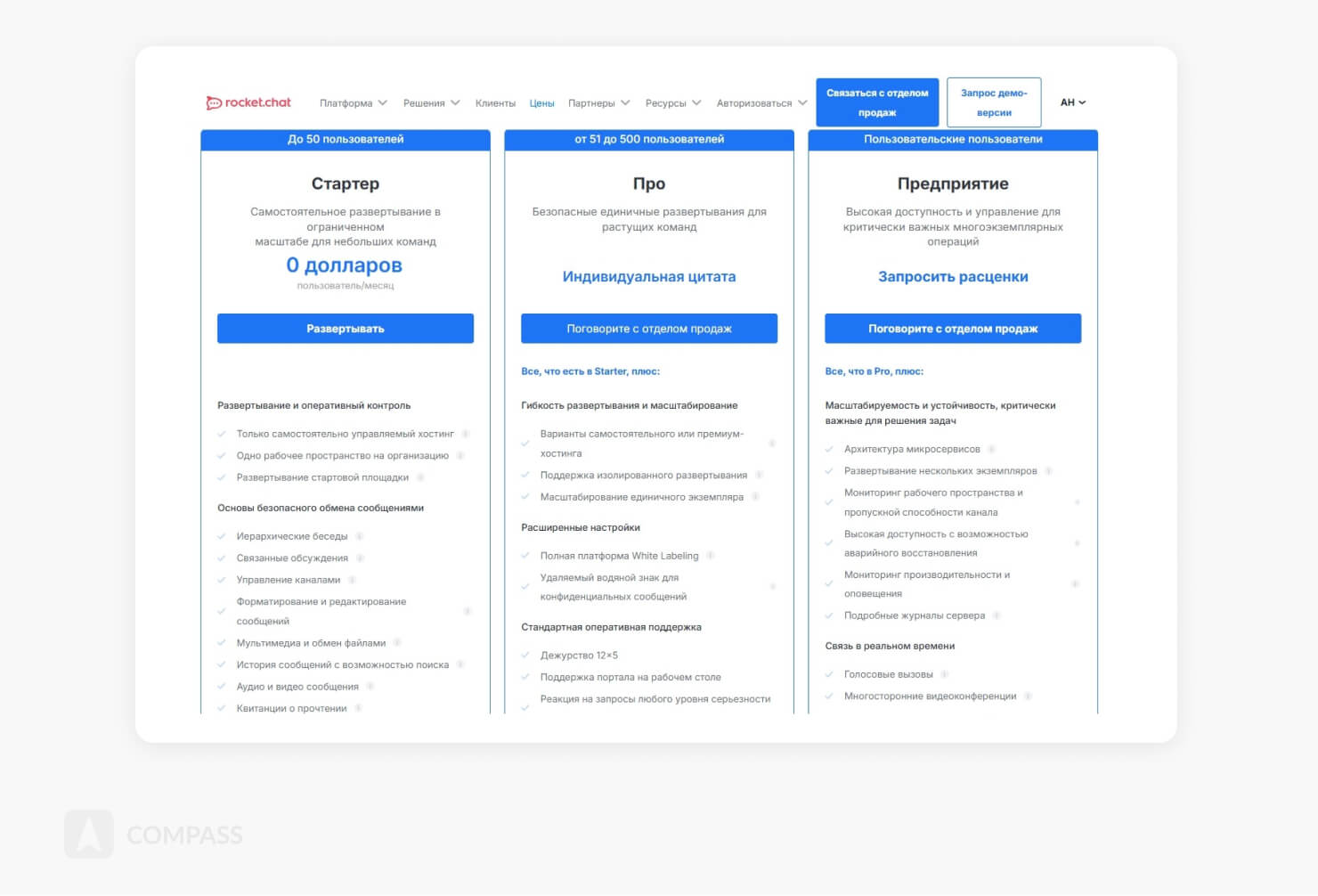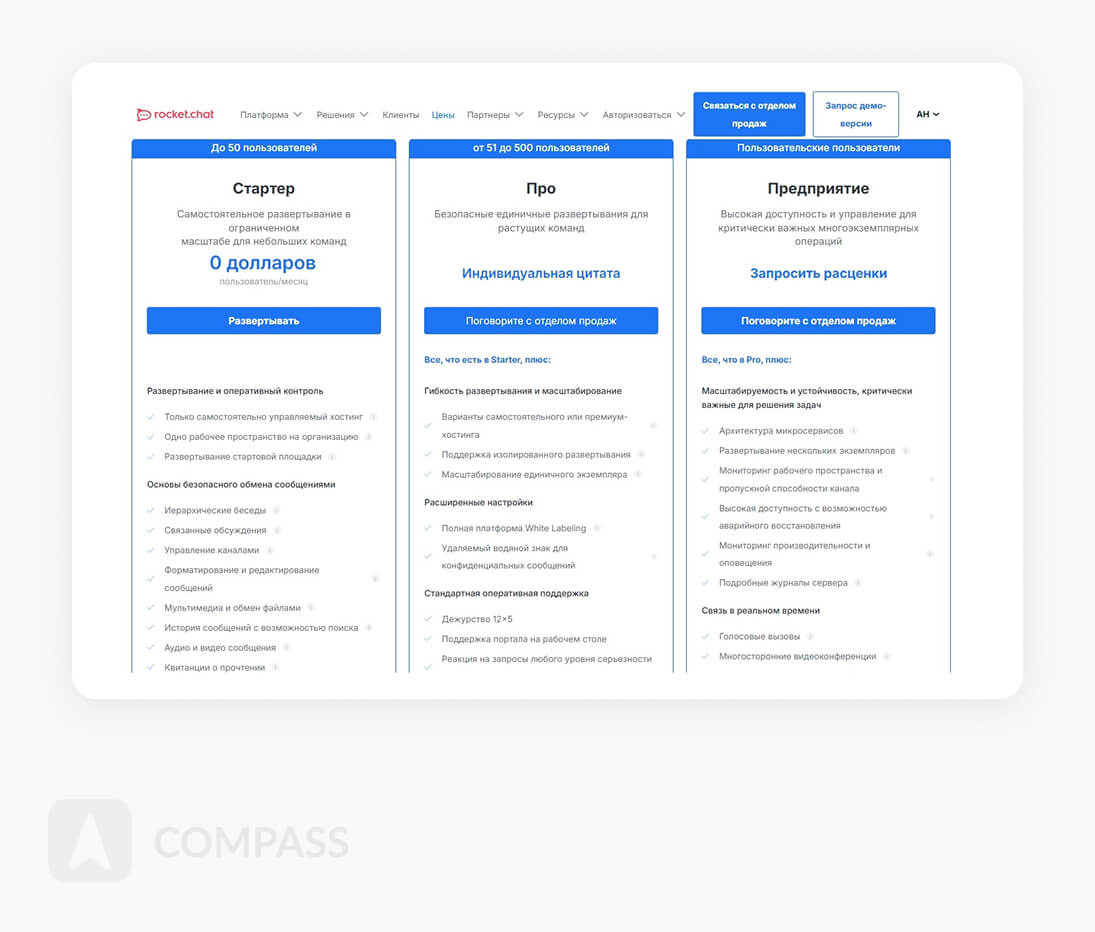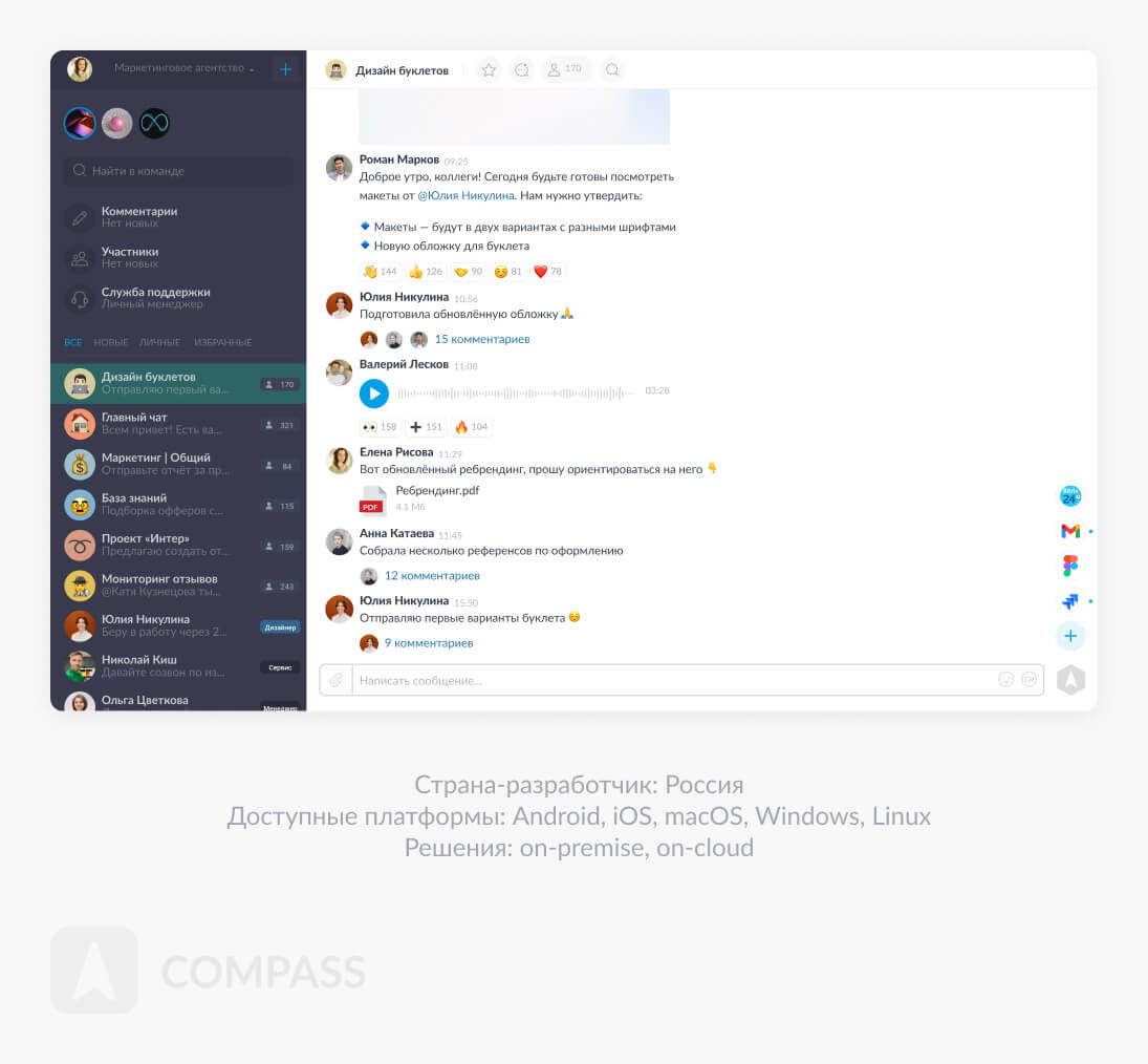 Compass — безопасный мессенджер для бизнеса, который можно использовать в облаке или поднять на своем сервере за 15 минут. Compass позволяет командам не просто общаться в личных и групповых чатах. Здесь доступны звонки, чтобы команды проводили созвоны и конференции. Лимитов по времени звонка нет, подключиться могут больше 1000 участников. Есть on-premise и on-cloud решения.