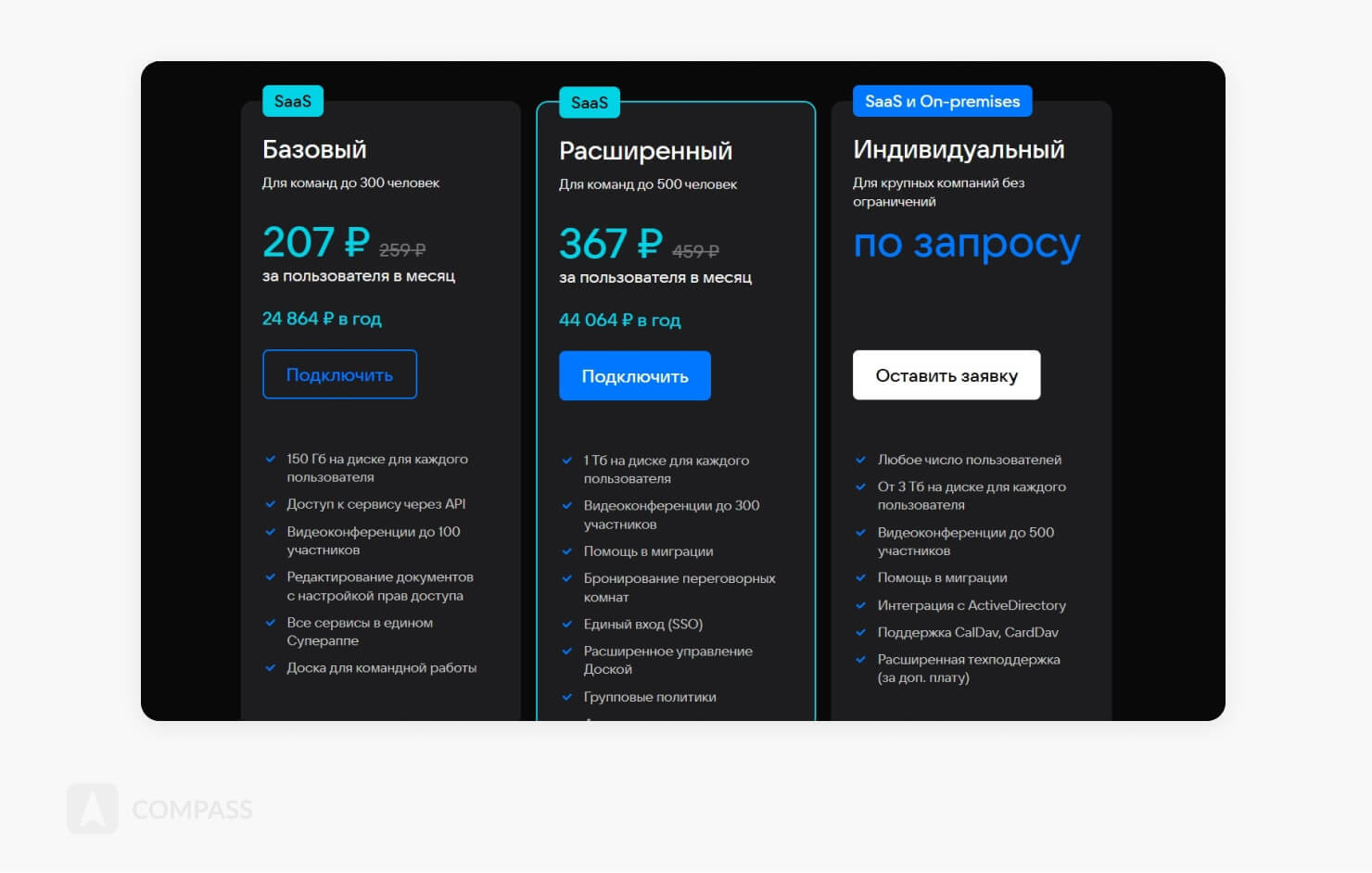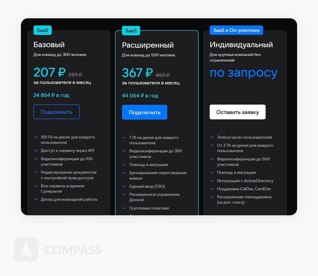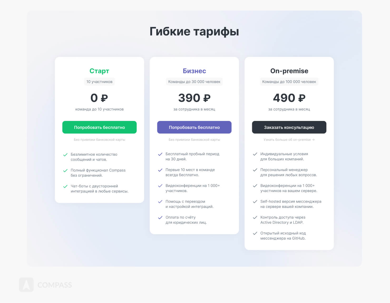 Compass — безопасный мессенджер для бизнеса, который можно использовать в облаке или поднять на своем сервере за 15 минут. Compass позволяет командам не просто общаться в личных и групповых чатах. Здесь доступны звонки, чтобы команды проводили созвоны и конференции. Лимитов по времени звонка нет, подключиться могут больше 1000 участников. Есть on-premise и on-cloud решения.