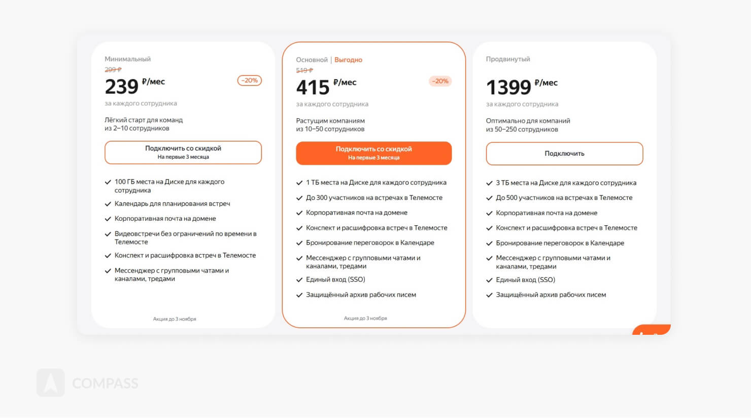 В подписку включены несколько продуктов. Цена зависит от выбранного тарифа. На разных тарифах меняется объем места на диске, количество участников на встречах в Телемосте.
