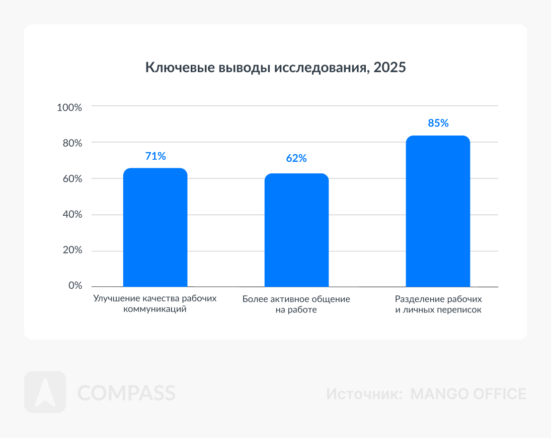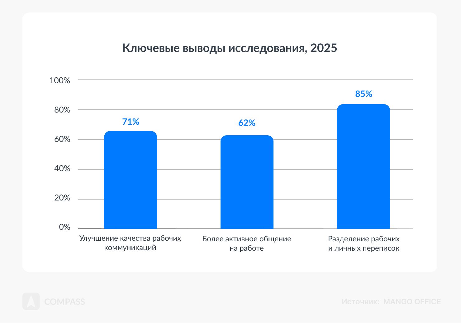 Бесконечные чаты отвлекают, и легко пропустить что-то важное. Сотрудники все чаще жалуются, что сообщений слишком много. По данным исследования, в 2025 году 62% респондентов будут общаться на работе еще больше, чем годом ранее. Поэтому нужен четкий план: когда что отправляем, кто за что отвечает, где общаемся и зачем.