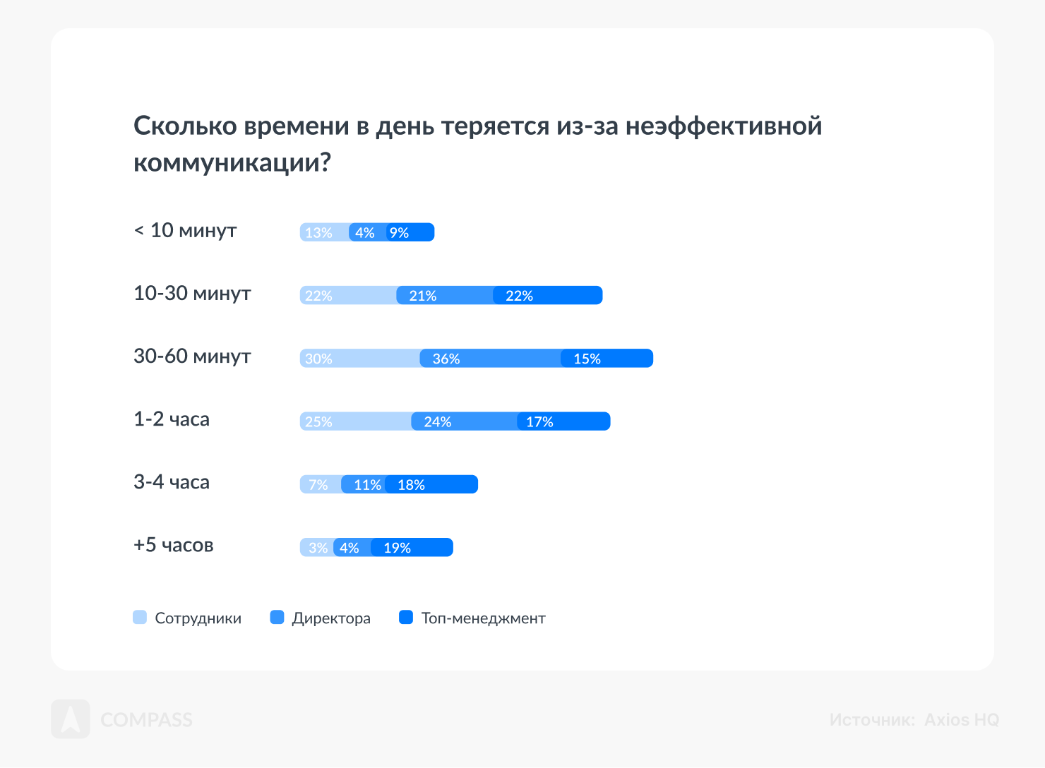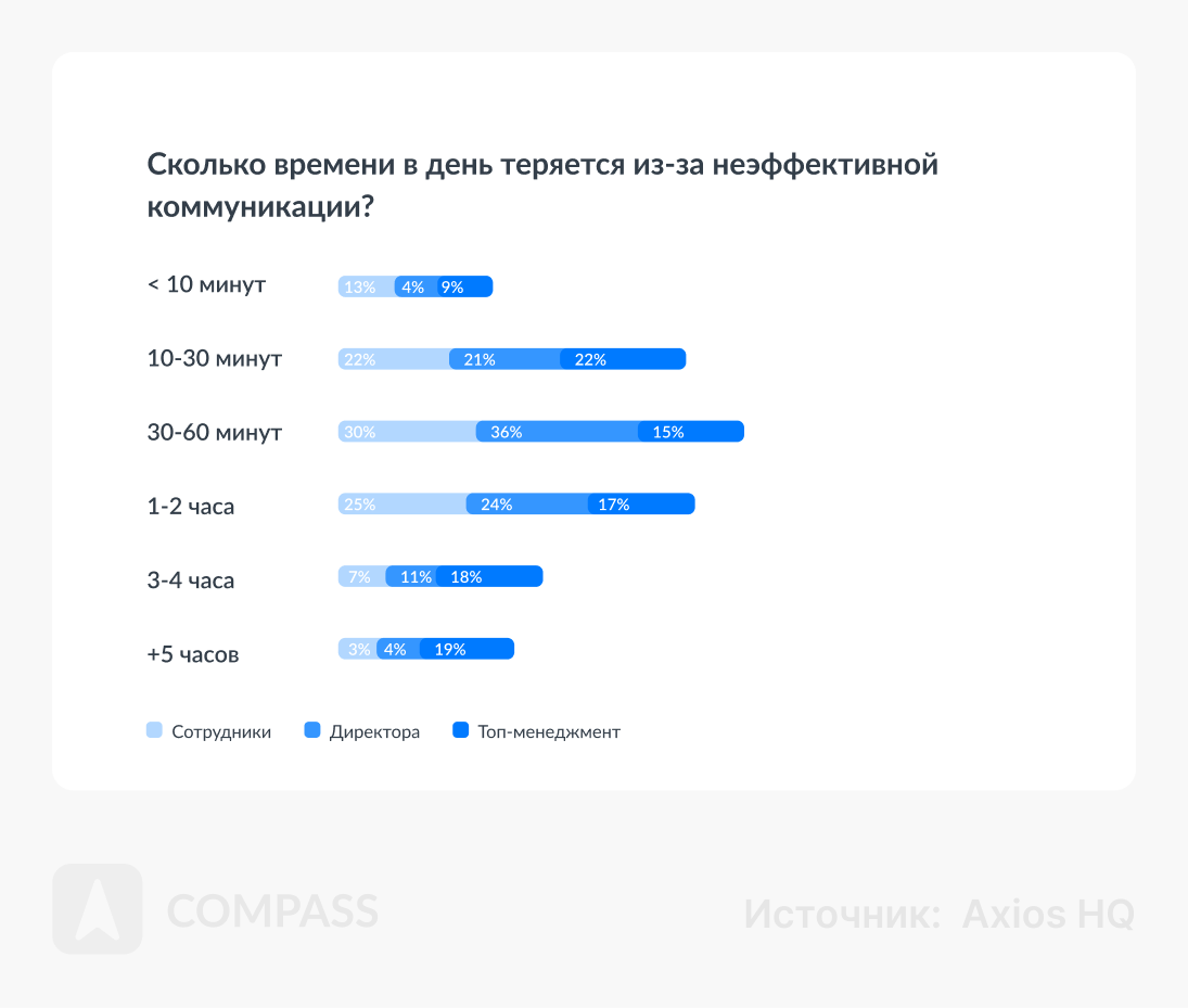 Сложность — враг коммуникации. Исследование показало, что 34% рабочего дня теряется на уточнения и лишние диалоги. Проблемы с общением внутри коллектива забирают много времени, особенно у руководителей среднего и высшего звена. Большая часть сотрудников тратит до двух часов, а топ-менеджмент — иногда более пяти часов ежедневно.