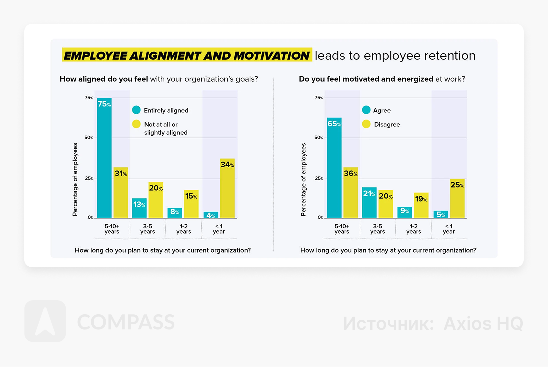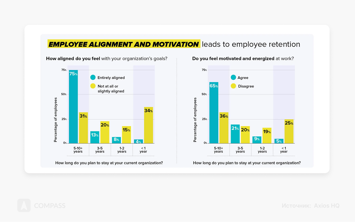 Если сотрудники не понимают цели компании и не чувствуют смысла своей работы, почти половина из них задумывается об уходе в ближайшие 1–2 года или раньше.