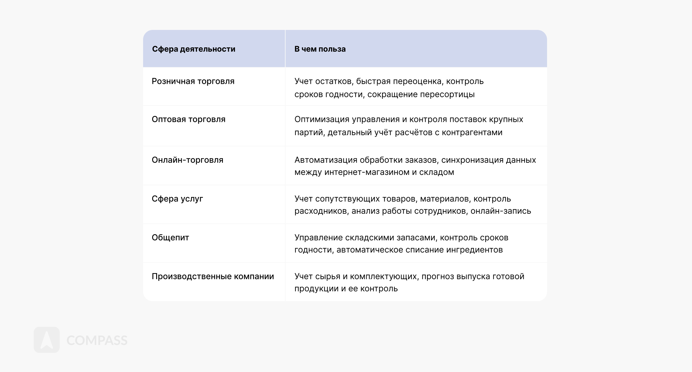 Информационная система учета товаров на складе учета полезна для разных компаний, не только для торговли, но и для сферы услуг или общепита. Без нее может обойтись микробизнес, у которого совсем небольшой ассортимент и остатки легко пересчитать вручную. В остальном же в разных сферах программа автоматизации торговли упрощает управление запасами и контроль продаж.