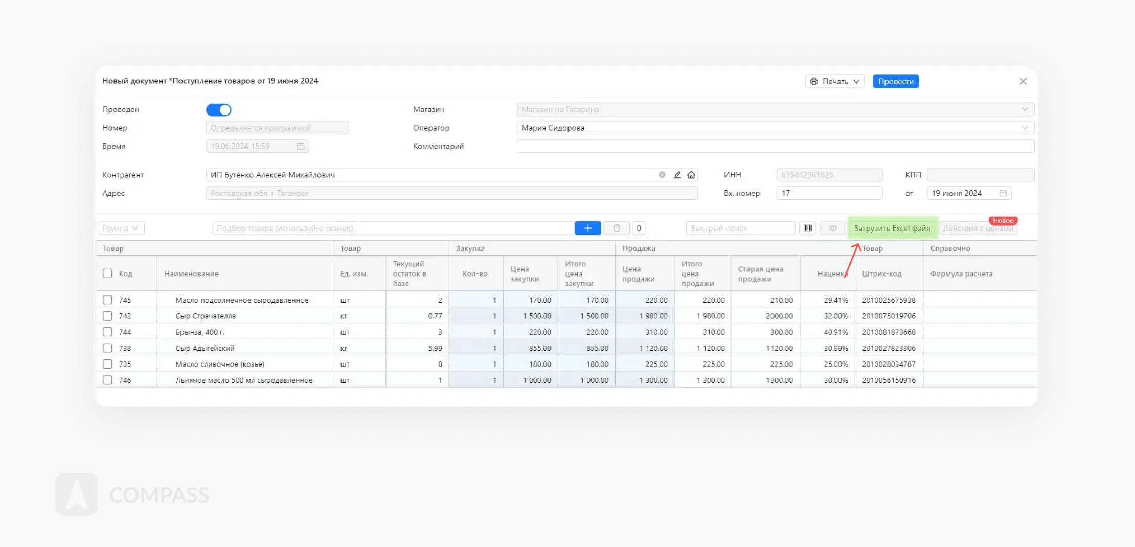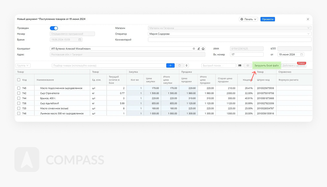 Например, в товароучетной системе Эвотор над штрих-кодами товаров справа есть кнопка «Загрузить excel-файл»