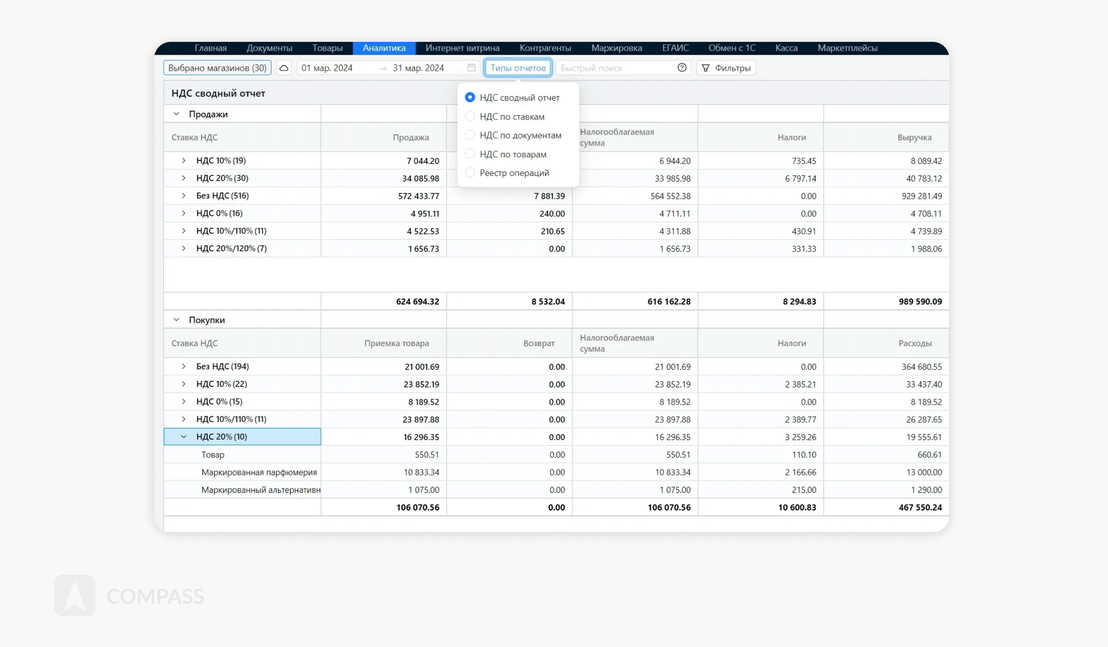 К примеру, такой отчет по НДС в «Управлении ассортиментом» поможет упростить создание налоговой отчетности. Чаще всего простая программа складского учета не сможет сгенерировать такой отчет