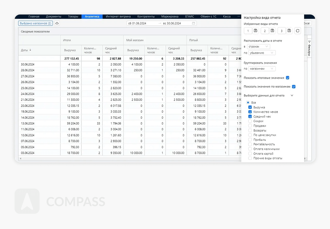 В «Управлении ассортиментом» настраивают отчеты по выручке магазинов или продажам товаров