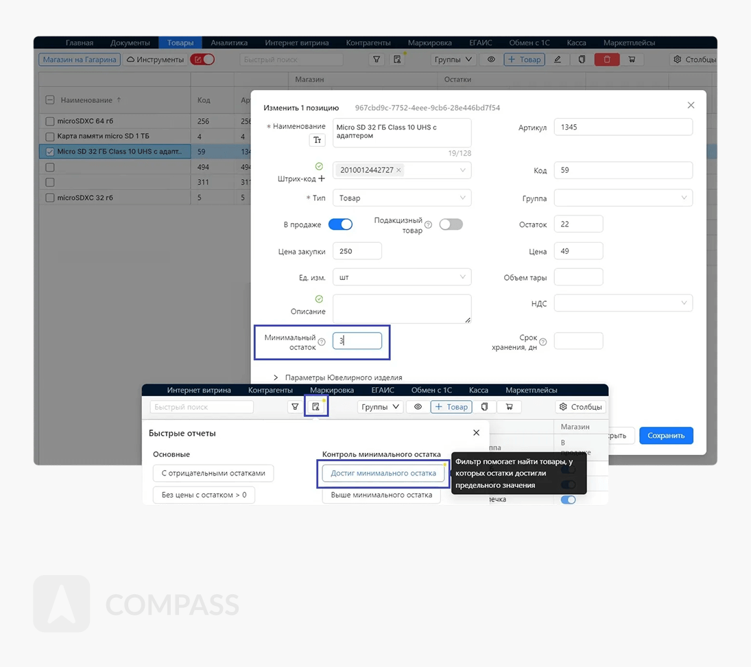 Работа с маркированными товарами, алкоголем, ювелирными изделиями. Есть интеграции с госсистемами, которые позволяют передавать данные о поступлении, списании или продаже маркированных товаров. В том числе есть интеграции с ЕГАИС для работы с алкоголем и с ГИИС ДМДК для работы с ювелирными украшениями.