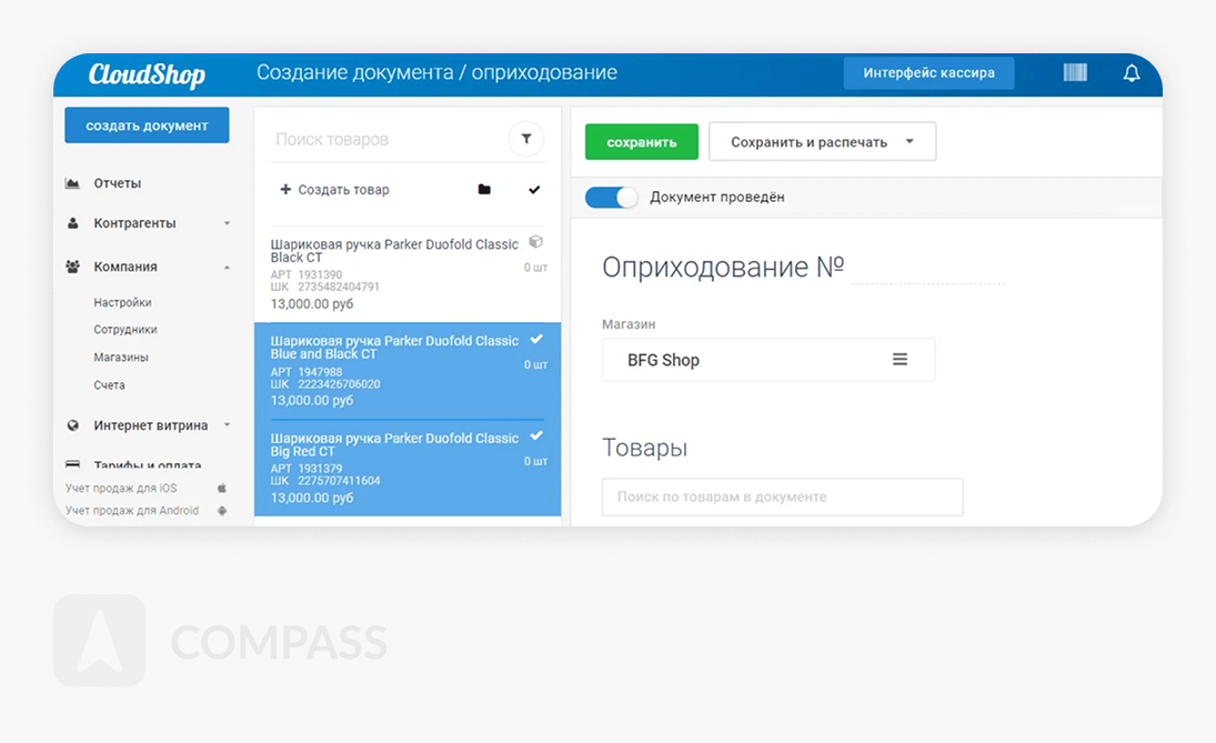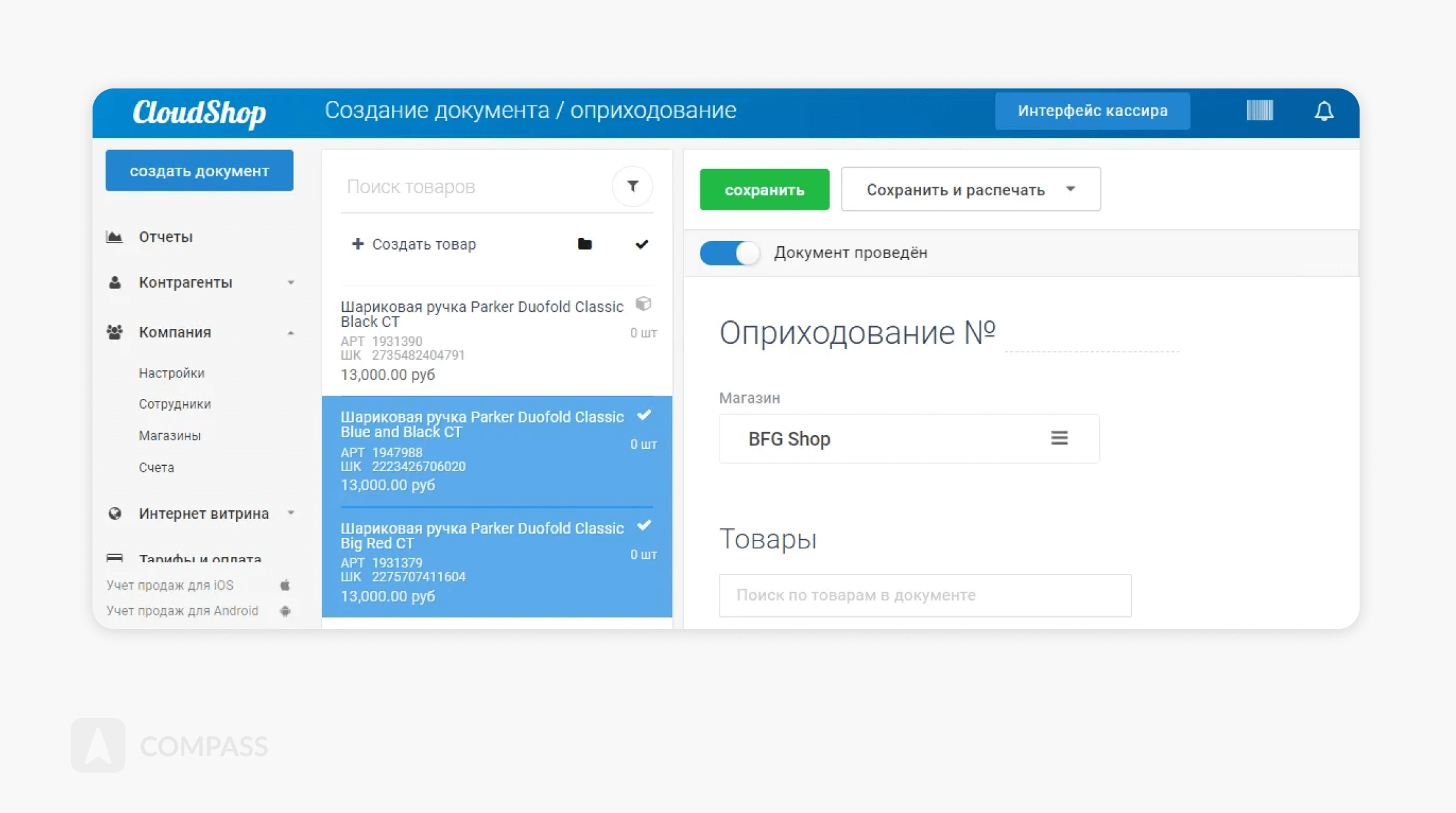 Отображение всех операций. Любые действия в системе отображаются через создание документов. Дальше информация об операциях сохраняется, ее можно посмотреть в отчетах или в карточках товаров.