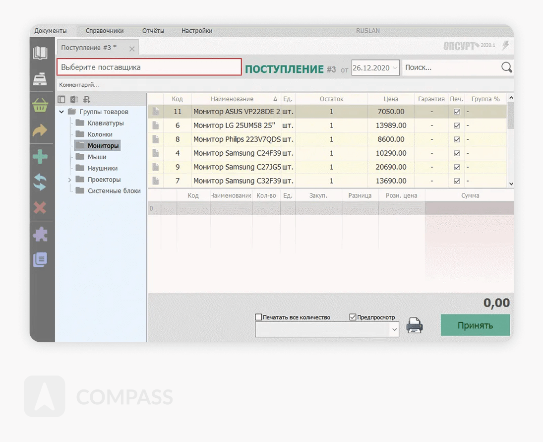 Приемку товара. Товар можно принимать по накладной или УПД, это займет намного меньше времени, чем ручной ввод данных. Чтобы сверить количество товара по документам и в реальности используют ТСД — терминал сбора данных. С его помощью считывают штрих-коды на упаковках, данные передают в программу для учета товара и продажи. Если есть расхождения, их также фиксируют с помощью ТСД.