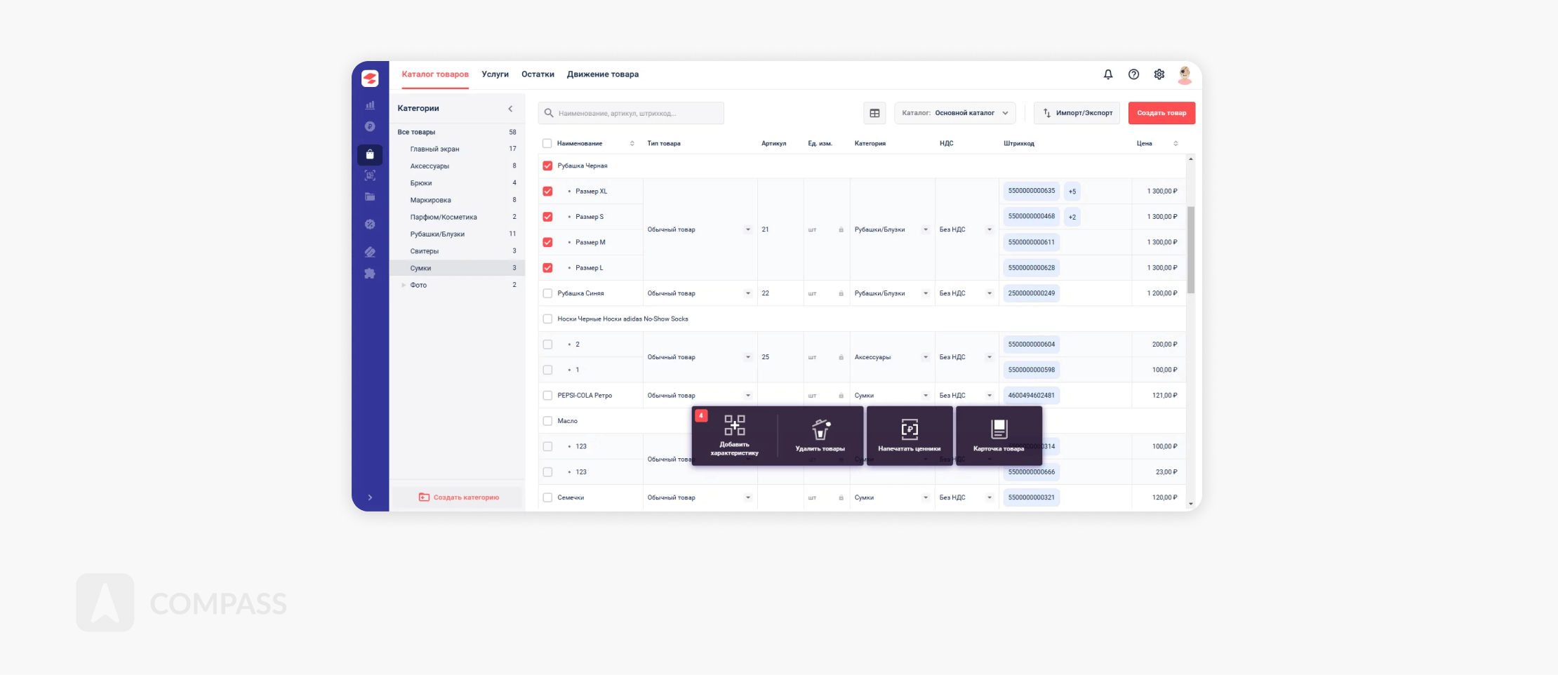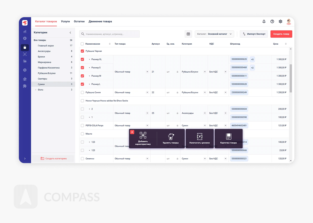 Работа с товарной базой. В системе любые действия с товарами можно выполнять вручную или с помощью оборудования. Например, создавать карточки для новых товаров удобно с помощью сканера — сканируете заводской штрих-код, а сервис учета товара подставит название из базы штрих-кодов. В товарной базе карточки редактируют, в том числе массово. Данные об изменениях обновляются на терминалах.