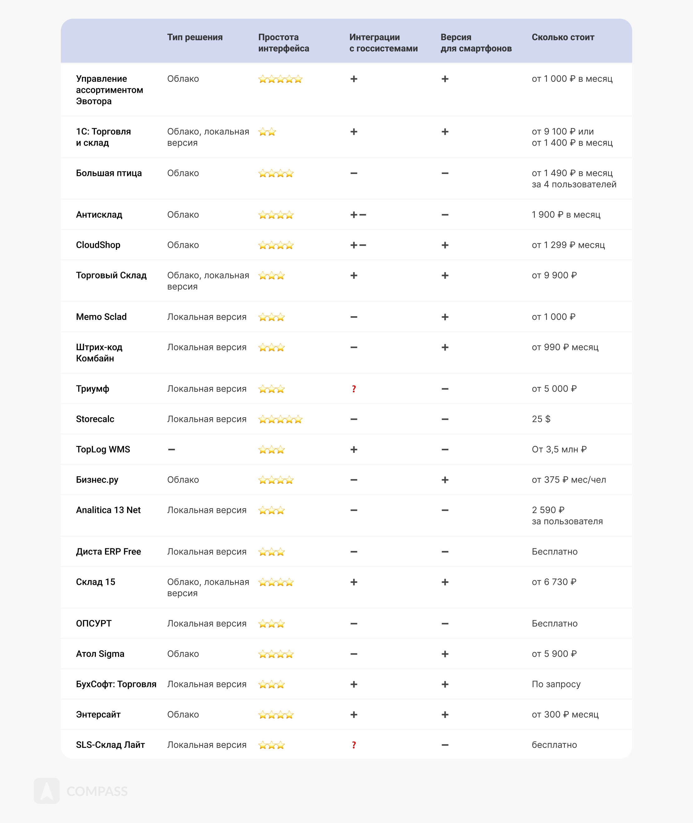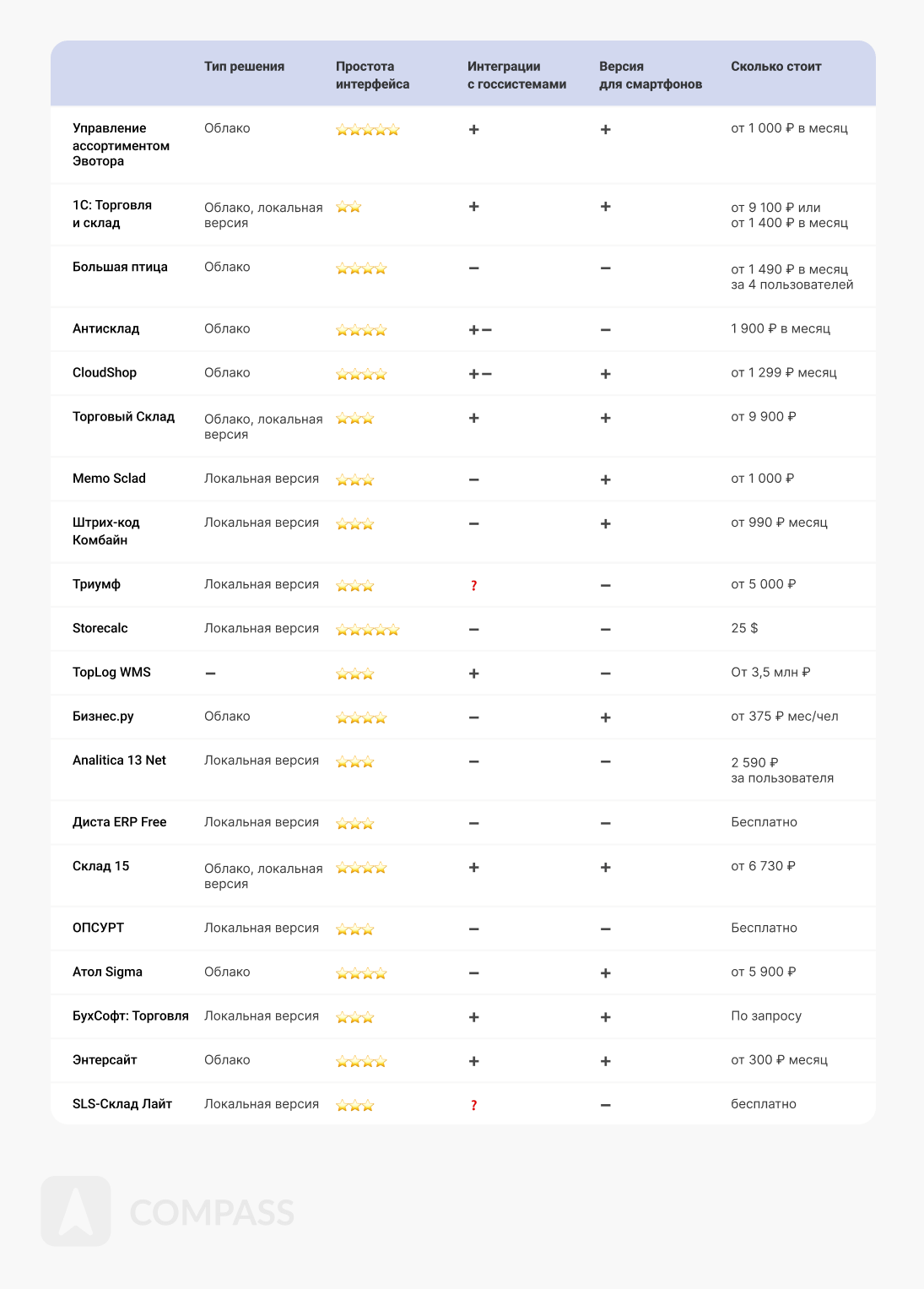 2 шаг. Соберите список сервисов, у которых есть все нужные функции. Учитывайте не только инструменты, но и тип решения. Например, кому-то удобнее работать в локальной программе для ведения учета товара, а кому-то — в облачной.